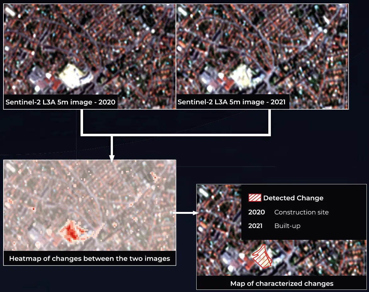 - Super-resolution and in-situ integration: Drawing from EvoLand’s method development innovations, the prototype enhances the spatial detail of detected changes, offering clearer insights on fine-scale urban dynamics.
